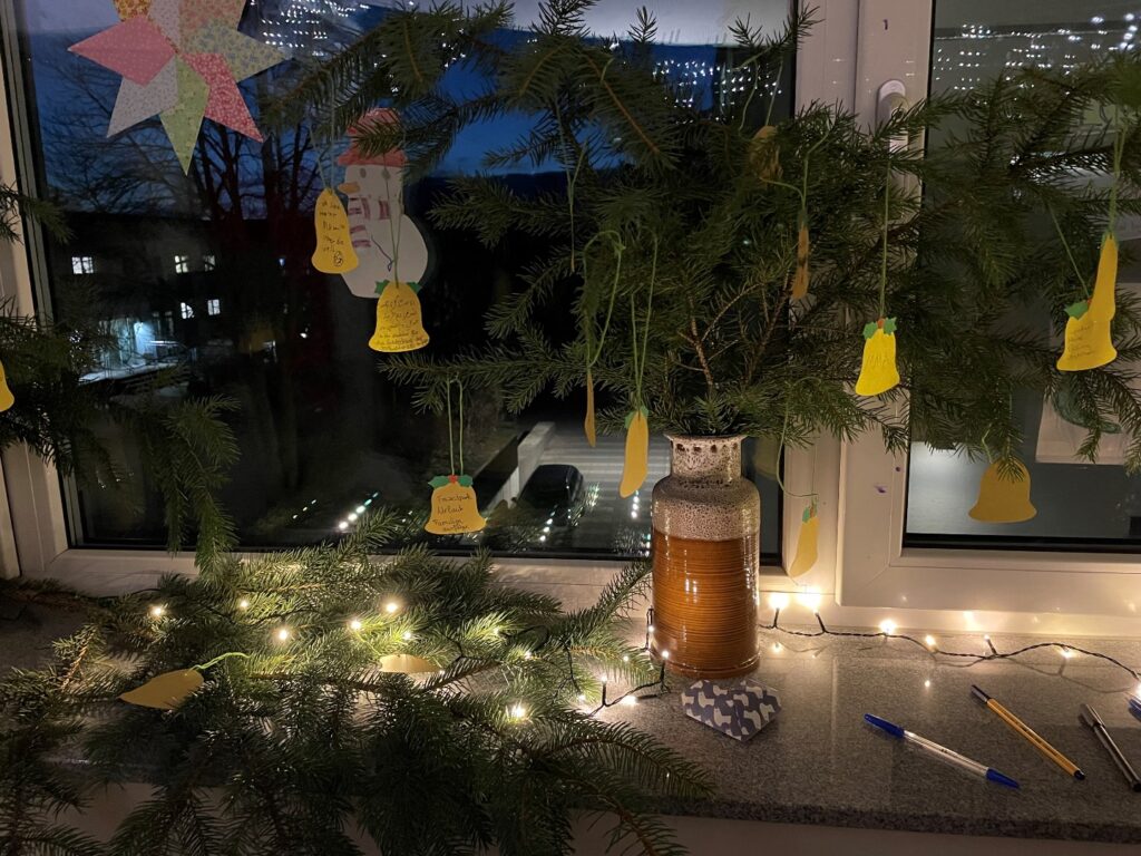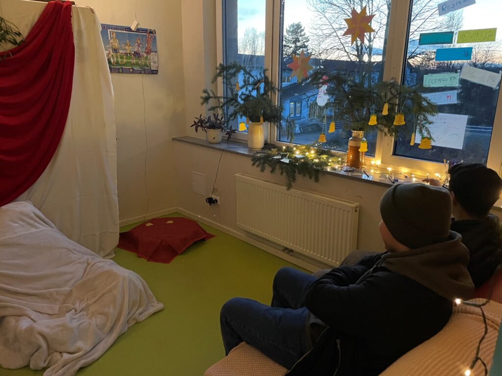 In dem fröhlichen Trubel von Punsch, Plätzchen, Basteleien, Verkaufsständen und Weihnachtsmusik empfand ich und ich denke auch viele Andere, unseren Raum als eine Oase. Man konnte zur Ruhe kommen. Da wir den Raum offiziell, als Raum der Ruhe angegeben hatten, kamen auch Sozialarbeiter und  -arbeiterinnen, auch Lehrerinnen interessiert schauen. Die Resonanz war durchweg positiv. Die Schulleiterin der Grundschule sagte spontan: „So etwas bräuchten wir das ganze Jahr über“. Die beiden Stationen (Freue dich Welt- mit zu beschriftenden Glocken und Geschenke, für die man dankbar ist – Dankesknete) wurden nicht nur von den Grund- sondern auch von den Realschülern gern angenommen. Uns Mitarbeitern hat dieser Nachmittag viel Freude gemacht.