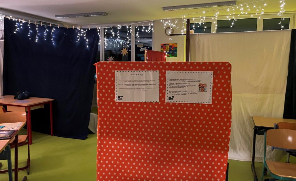 Wir haben zu dritt geplant und durchgeführt. Ich bin sehr dankbar darüber, dass und wie uns Gott zusammengestellt hat. Das Ganze war ja sehr kruzfristig ins Rollen gekommen. Wir waren Teil des Adventmarktes an diesen Schulen. Dass die 1und 1/2 Stunde zum Aufbau gereicht hat und wir letzlich auch genau das richtige Material dabei hatten, um den Raum schön zu gestalten, ist für mich ein Wunder.