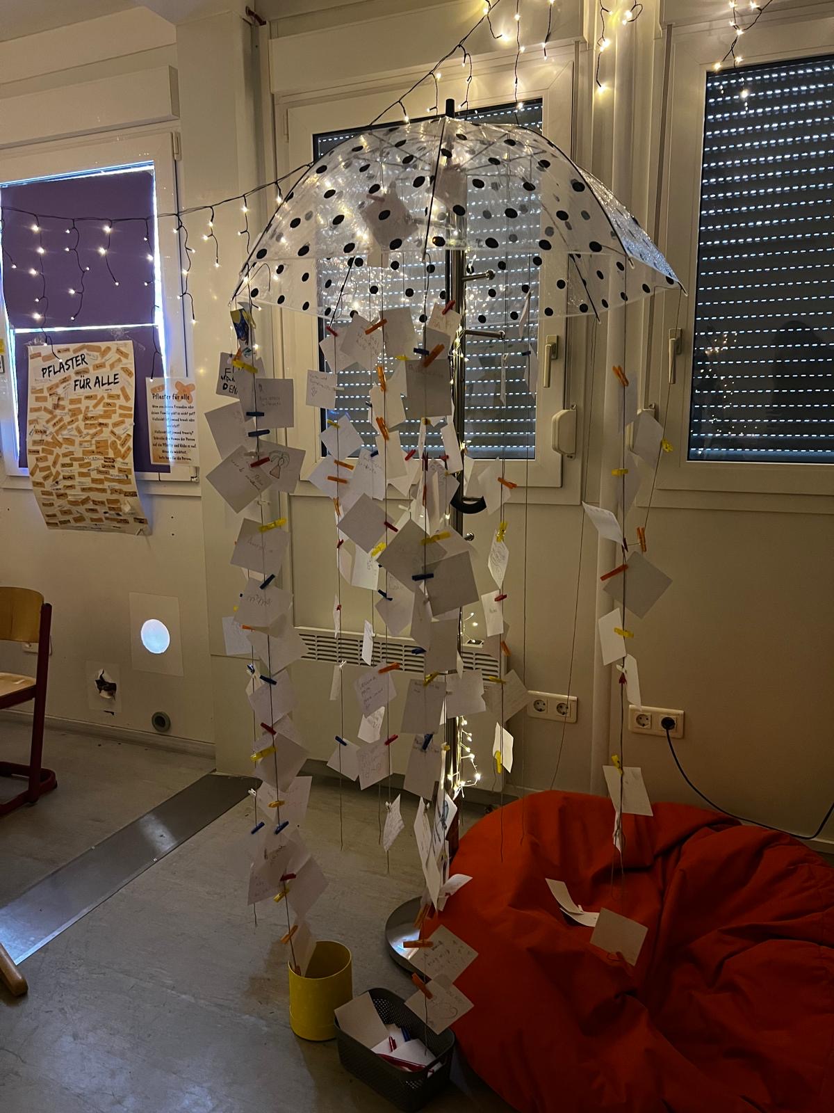 Ein Regenschirm bedeckt uns und hält uns trocken. Er schützt uns.